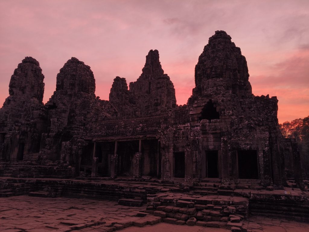 I went to the Bayon Temple, and there were only two other people and some monkeys while the sun was setting and the sky turned pink.